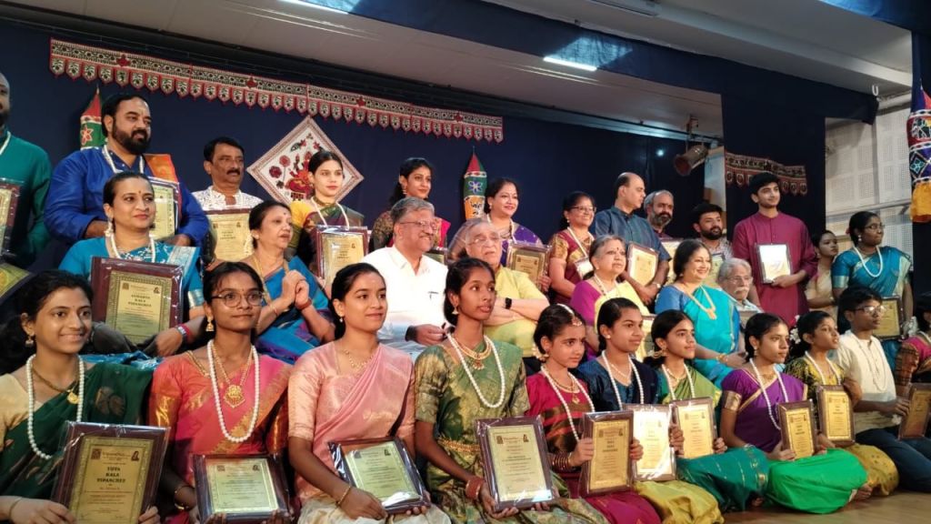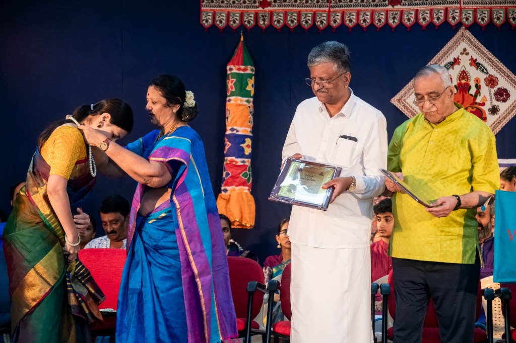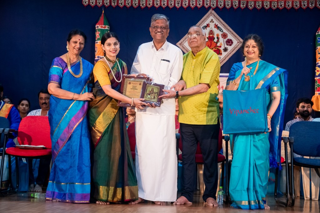 Jathiswaraalayan Keerthana S receiving the title ‘Natya Kala Vipanchee’ in Margazhi Utsav at R K Swami Auditorium, Chennai
